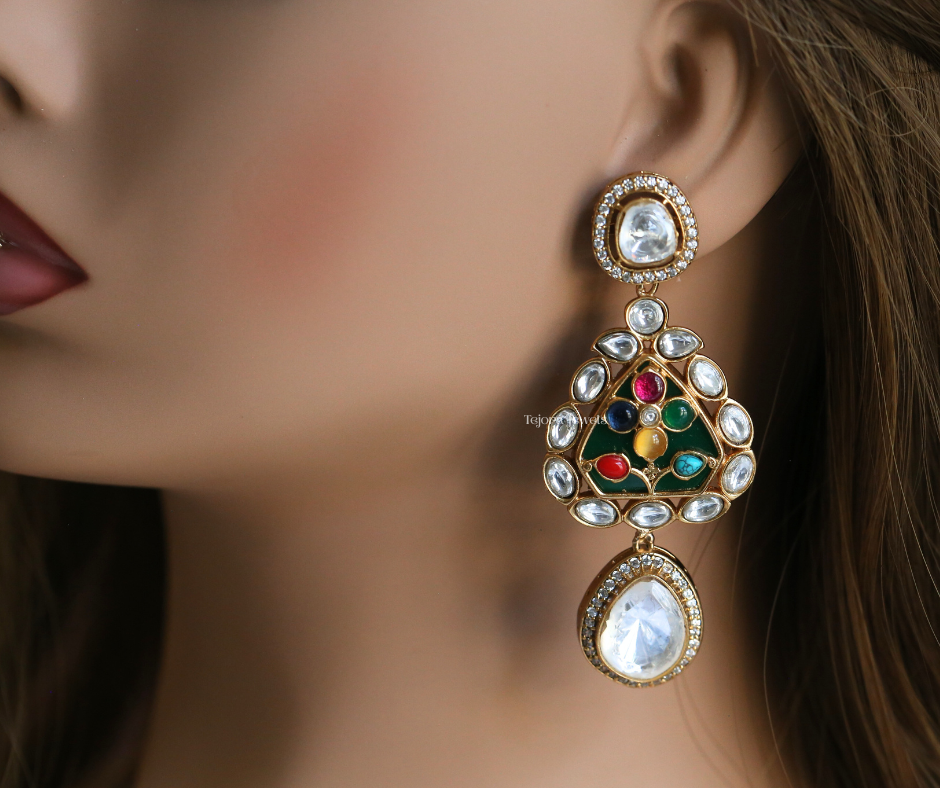 Handcrafted with premium Moissanite stones, premium gold detailing, and vibrant multi-color gems in inlay work — these earrings are perfect for weddings, festivals, parties, and all special occasions.