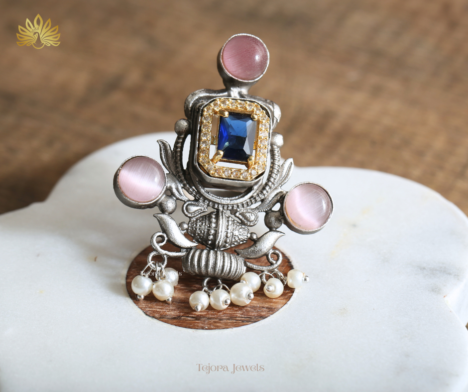 Step into timeless royalty with this exquisite silver replica ring, a masterpiece of intricate craftsmanship. A deep sapphire-blue emerald-cut stone commands the center, framed in sparkling gold-tone CZ halo for radiant brilliance. Flanked by soft pink Monalisa stones with their signature cat-eye shimmer—one crowning the top and twins on either side—the design flows into ornate oxidized silver filigree, paisley motifs, and a dangling ghungroo style cluster of creamy pearls that sway delicately with movement. The antique finish and dual-tone accents evoke the grandeur of heritage jewelry with effortless modern appeal.