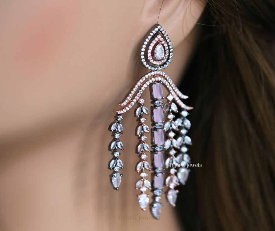 Pure bridal magic in motion. These jaw-dropping long chandelier earrings blend Victorian grandeur with modern sparkle – featuring soft blush-pink doublet stones cascading among hand-set AAA-grade American diamonds (CZ) in a dramatic rose-gold + black rhodium finish.